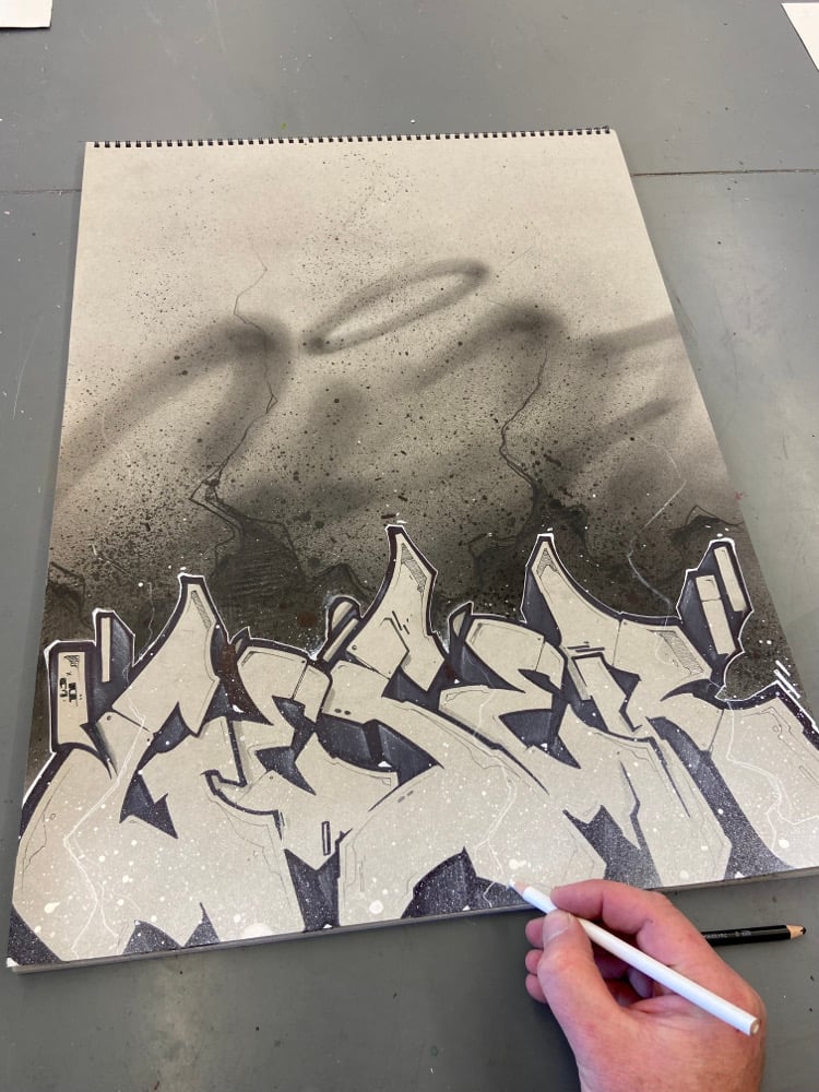 *Ink, pencil, spray paint on 18x24 inch gray-toned acid-free paper…