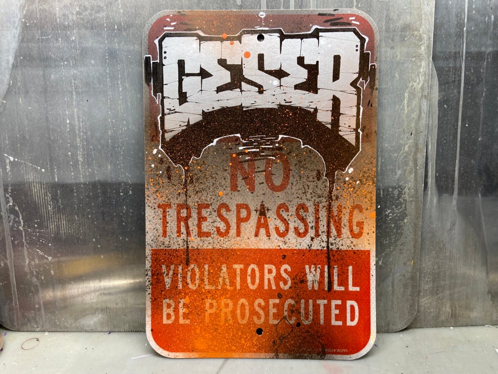 (When it comes to hanging graffiti on you wall, Nothing compares to the look and authenticity of a metal No trespassing sign... "found" by the artist while out exploring, and brought back to the studio)